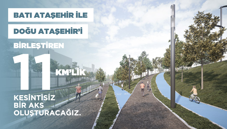 -416 bin Ataşehirlinin hayatını kolaylaştıracak vizyon projemizle, ilçemizi bir ucundan diğer ucuna bağlayacağız. Bunu mevcut güzergahları kullanarak yapacak, Ataşehir’in doğusu ile batısını birleştiren 11 km’lik kesintisiz bir aks üzerinde bir yaşam koridoru oluşturacağız.